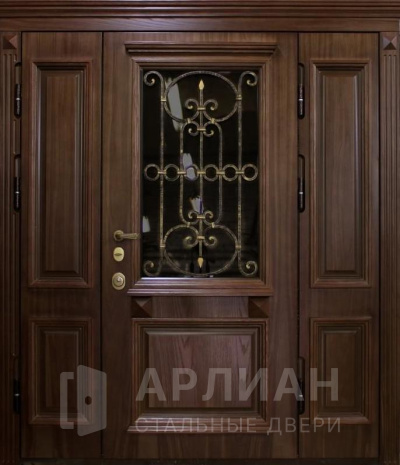 Входная арочная дверь с витражом и решеткой №419